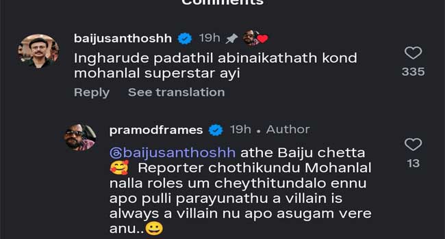 എനിക്ക് മോഹൻലാലിനൊപ്പം പ്രവർത്തിക്കാൻ ഇനിയും അവസരം കിട്ടിയിട്ടില്ലായെന്നായിരുന്നു അടൂർ വേദിയിൽ പറഞ്ഞത്. എന്നാൽ ഇതിനുള്ള ത​ഗ് മറുപടിയാണ് സമൂ​ഹമാധ്യമങ്ങളിൽ വൈറൽ. ഇങ്ങേരുടെ പടത്തിൽ അഭിനയിക്കാത്തത് കൊണ്ട് മോഹൻലാൽ സൂപ്പർസ്റ്റാർ ആയി’ എന്നാണ് പരിപാടിയുമായി ബന്ധപ്പെട്ട് സമൂഹമാധ്യമങ്ങളിൽ വൈറലായ ഒരു വീഡിയോക്ക് താഴെ താരം കമന്റ് ചെയ്തിരിക്കുന്നത്. ശേഷം നിരവധി പേരാണ് ബൈജുവിന് പിന്തുണയുമായി കമന്റ് ചെയ്യുന്നത്.