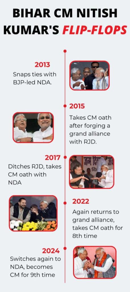 പകരം ബിജെപി മന്ത്രി സഭയിൽ വന്നു. തമാശ എന്താണെന്ന് വച്ചാൽ ആർജെഡിക്ക് 75 ഉം ബിജെപി ക്ക് 74 ഉം സീറ്റുകളുള്ളപ്പോഴാണ് 43 സീറ്റ് മാത്രമുള്ള നിതീഷ് ഇരുപാർട്ടികളേയും കുരങ്ങു കളിപ്പിച്ച് 5 കൊല്ലം മുഖ്യമന്ത്രിക്കസേരയിൽ ഇരുന്നത്. 2024 ന് മുമ്പുുള്ള ചാട്ടങ്ങൾക്കെല്ലാം എന്തെങ്കിലും കാരണങ്ങൾ പുള്ളി പറയാറുണ്ടായിരുന്നെങ്കിലും ഇത്തവണത്തെ ചാട്ടത്തിന് പ്രത്യേകിച്ച് കാരണമൊന്നും ഉണ്ടായിരുന്നില്ല.