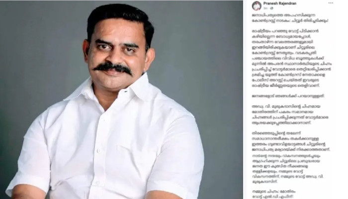 പാലക്കാട്: ചിറ്റൂർ മണ്ഡലത്തിലെ ബി.ജെ.പി സ്ഥാനാർഥിയുടെ ഔദ്യോഗിക ഫേസ്ബുക്ക് പേജിൽ എൽ.ഡി.എഫ് സ്ഥാനാർഥിക്കായി വോട്ട് അഭ്യർഥിച്ച് പോസ്റ്റ്. ബി.ജെ.പി സ്ഥാനാർഥി പ്രണേഷ് രാജേന്ദ്രന്റെ പേജിലാണ് എൽ.ഡി.എഫ് സ്ഥാനാർഥി അഡ്വ. വി. മുരുകദാസിന് വോട്ട് ചെയ്യണമെന്ന് ആഹ്വാനം ചെയ്യുന്ന കുറിപ്പ് വന്നത്. മിനിറ്റുകൾക്കകം പോസ്റ്റ് പിൻവലിച്ചെങ്കിലും സ്ക്രീൻഷോട്ടുകൾ പ്രചരിച്ചതോടെ മണ്ഡലത്തിൽ ‘ഡീൽ’ ആരോപണം ശക്തമായി.