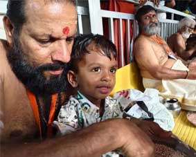 കൃഷ്ണശിലാ മണ്ഡപത്തിൽ പാരമ്പര്യ എഴുത്താശാന്മാരായ വഴുതക്കാട് മുരളീധരൻ, പി.സി. സത്യനാരായണൻ, പ്രഭേഷ് പണിക്കർ എന്നിവരും സരസ്വതീ മണ്ഡപത്തിൽ മലയാളത്തിലെ പ്രമുഖരായ 40 എഴുത്തുകാരും അരിയിട്ട വെള്ളിത്തളികയിലും നാവിൻതുമ്പിലും കുരുന്നുകൾക്ക് ഹരിശ്രീ കുറിക്കുകയാണ്.