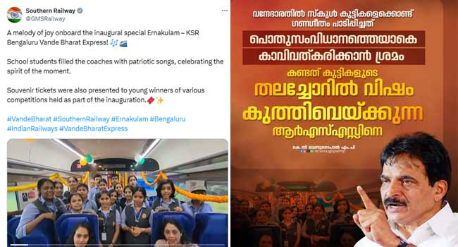 “ജനങ്ങൾക്ക് വേണ്ടി ജനങ്ങളാൽ തെരഞ്ഞെടുക്കപ്പെട്ടൊരു സർക്കാർ, അതിന്റെ സംവിധാനത്തെയൊട്ടാകെ അങ്ങേയറ്റം സംഘി വത്കരിച്ചുകഴിഞ്ഞു. എറണാകുളത്ത് നിന്ന് ഫ്ലാഗ് ഓഫ് ചെയ്ത വന്ദേഭാരത് എക്സ്പ്രസിൽ കണ്ട കാഴ്ച അതിന്റെ ഏറ്റവും ഒടുവിലെ ഉദാഹരണം മാത്രമാണ്. സ്കൂൾ കുട്ടികളെക്കൊണ്ട് ആർഎസ്എസ് ഗണഗീതം പാടിപ്പിച്ച്, അത് ദക്ഷിണ റെയിൽവേയുടെ ഔദ്യോഗിക ഫേസ്ബുക്ക് അക്കൗണ്ടിൽ നിന്ന് പോസ്റ്റ് ചെയ്ത നടപടി അങ്ങേയറ്റം പ്രതിഷേധാർഹമാണ്. ഇവിടെ റെയിൽവേ പൊതുസമൂഹത്തിന് നൽകുന്ന സന്ദേശം എന്താണ്?
