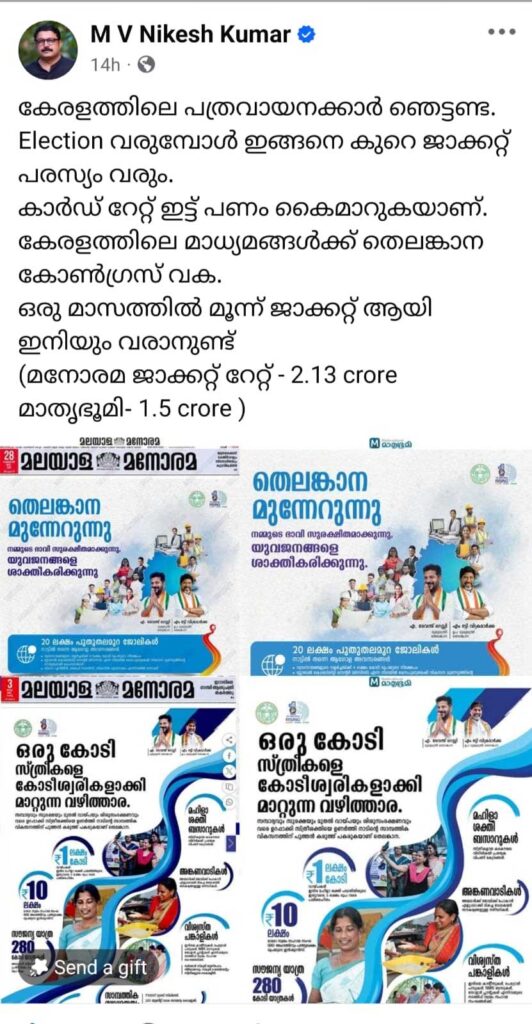 ഇത്രയുമാണ് കേരളത്തിലെ മാധ്യമപ്രവർത്തകരിൽ മുൻനിരയിലുണ്ടായിരുന്ന നികേഷ് കുമാറിന്റെ പോസ്റ്റ്. അതായത് തെരഞ്ഞെടുപ്പ് പ്രമാണിച്ച് കോൺഗ്രസ് മാധ്യമങ്ങളെ വിലക്കെടുക്കുന്നു എന്നതാണ് പുള്ളി പറയാതെ പറയുന്നത്. അതാണല്ലോ പരസ്യം നൽകുന്നതിനെ പണം കൈമാറുകയാണ് എന്ന് വിശേഷിപ്പിക്കുന്നതിലൂടെ അല്ലെങ്കിൽ ആരോപിക്കുന്നതിലൂടെ ഉദ്ദേശിക്കുന്നത്. മനോരമയ്ക്ക് 2 കോടിയും മാതൃഭൂമിക്ക് ഒന്നര കോടിയും ഒക്കെയാണ് നിരക്കെന്നും പോസ്റ്റിലൂടെ ഉദ്ബോധിപ്പിക്കുന്നുമുണ്ട്.
