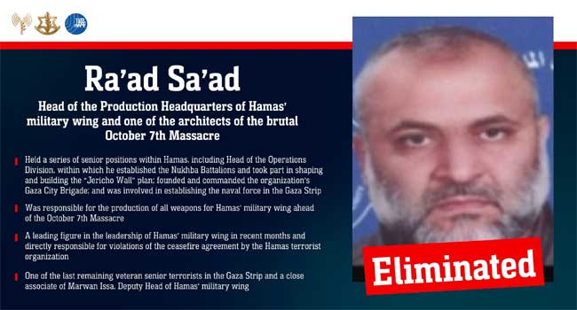ദീർഘകാലം ഹമാസിന്റെ അംഗമായിരുന്ന റാദ് സാദ്, ഗാസ സിറ്റി ബ്രിഗേഡിന്റെ സ്ഥാപകനും കമാൻഡറുമായിരുന്നുവെന്നും ഹമാസിന്റെ നാവിക സേന രൂപീകരിക്കുന്നതിൽ നിർണായക പങ്കുവഹിച്ചതായും ഇസ്രയേൽ സൈന്യം വ്യക്തമാക്കി. പിന്നീട് ഹമാസിന്റെ ഓപ്പറേഷൻസ് ഹെഡ്ക്വാർട്ടേഴ്സിന്റെ ചീഫായി നിയമിതനായ സാദ്, ഒക്ടോബർ 7 ആക്രമണത്തിന് നേതൃത്വം നൽകിയ എലിറ്റ് നുഖ്ബ ഫോഴ്സ് രൂപീകരണത്തിലും പങ്കാളിയായിരുന്നുവെന്നാണ് റിപ്പോർട്ടുകൾ.