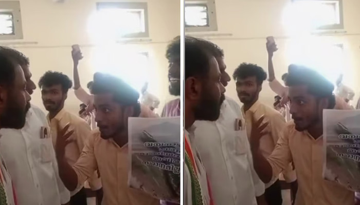 വയനാട് ഫണ്ട് മുക്കിയ കോണ്ഗ്രസിന് വോട്ടില്ലെന്ന പോസ്റ്റര് ഉയര്ത്തി എസ്.എഫ്.ഐ പ്രവര്ത്തകര് പ്രതിഷേധിച്ചു. ഇതിനിടെ മോഹനന്റെ കൂടെയുണ്ടായിരുന്നവരും എസ്.എഫ്.ഐ പ്രവര്ത്തകരും ഉന്തുംതള്ളുമുണ്ടായി. ഇതിനിടെ സ്ഥാനാര്ത്ഥിയെ കൂക്കിവിളിച്ചു. അത്രയ്ക്ക് ധൈര്യമുണ്ടെങ്കില് നീ സ്ഥാനാര്ഥിയെ അടിക്കെടായെന്ന് പറഞ്ഞു യുഡിഎഫ് പ്രവര്ത്തകരും മുന്നോട്ടു വന്നതോടെ സംഘര്ഷം കനത്തു.
