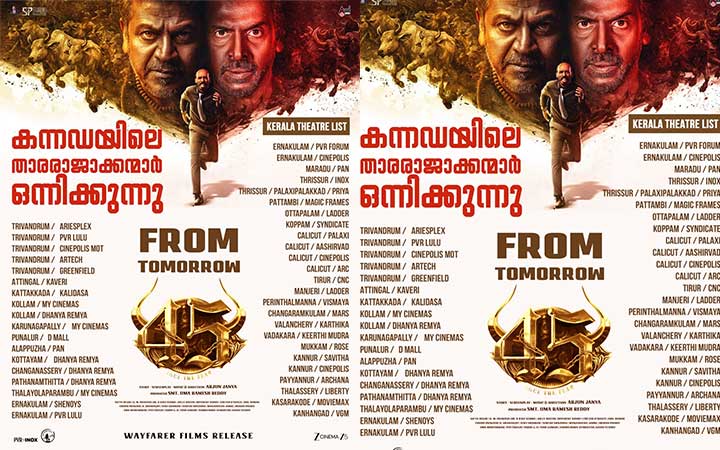 ശിവരാജ് കുമാർ – രാജ് ബി ഷെട്ടി- ഉപേന്ദ്ര- അർജുൻ ജന്യ പാൻ ഇന്ത്യൻ ചിത്രം “45 ” മലയാളം പതിപ്പ് നാളെ മുതൽ; ചിത്രം കേരളത്തിലെത്തിക്കുന്നത് ദുൽഖർ സൽമാന്റെ വേഫറെർ ഫിലിംസ്