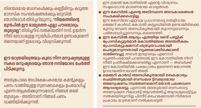 നിരന്തരമായ വേദനകൾക്കും കണ്ണീരിനും കടുത്ത മാനസിക സംഘർഷങ്ങൾക്കും ഒടുവിൽ ഞാനിപ്പോൾ തിരിച്ചറിയുന്നു, “നിയമത്തിന്റെ മുൻപിൽ ഈ രാജ്യത്തെ എല്ലാ പൗരന്മാരും തുല്യരല്ല” തിരിച്ചറിവ് നൽകിയതിന് നന്ദി. ഉയർന്ന നീതി ബോധമുള്ള ന്യായിധിപൻമാർ ഉണ്ടാകുമെന്ന് തന്നെയാണ് ഇപ്പോഴും വിശ്വസിക്കുന്നത്.
