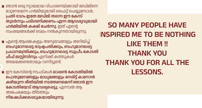 * എന്റെ ആശങ്കകളും അനുഭവങ്ങളും അറിയിച്ച് ബഹുമാനപ്പെട്ട രാഷ്ട്രപതിക്കും, ബഹുമാനപ്പെട്ട പ്രധാനമന്ത്രിക്കും, ബഹുമാനപ്പെട്ട സുപ്രീം കോടതി ചീഫ് ജസ്റ്റിസിനും എനിക്ക് കത്തുകൾ അയക്കേണ്ടതായും വന്നിട്ടുണ്ട്.