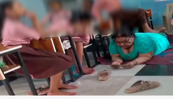 മൊബൈല് ഫോണ് നോക്കിക്കൊണ്ടാണ് അധ്യാപിക നിലത്ത് കിടക്കുന്നത്. സ്കൂളിലെ പ്രധാനാധ്യാപികയാണ് മധുറായ്. സംഭവത്തെ തുടര്ന്ന് മധു റായിയെ സസ്പെന്റ് ചെയ്തു. 23 സെക്കന്റ് ദൈര്ഘ്യമുള്ള വിഡിയോയില് അഞ്ചാംക്ലാസ് വിദ്യാര്ഥിനികളാണുള്ളത്.