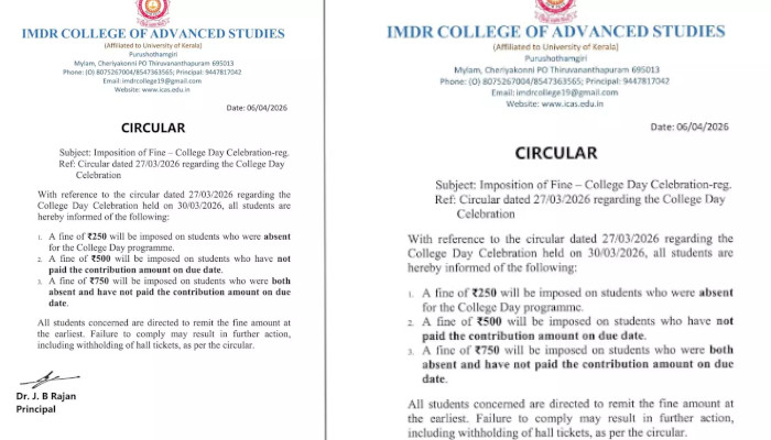 കോളജ് ഡേയില്‍ പങ്കെടുത്തില്ലെങ്കില്‍ 750 രൂപ പിഴ, കൂടാതെ ഹാൾ ടിക്കറ്റ് നല്‍കില്ലെന്ന ഭീഷണിയും, തിരുവനന്തപുരം ഐഎംഡിആർ കോളജിനെതിരെ വ്യാപക പ്രതിഷേധം
